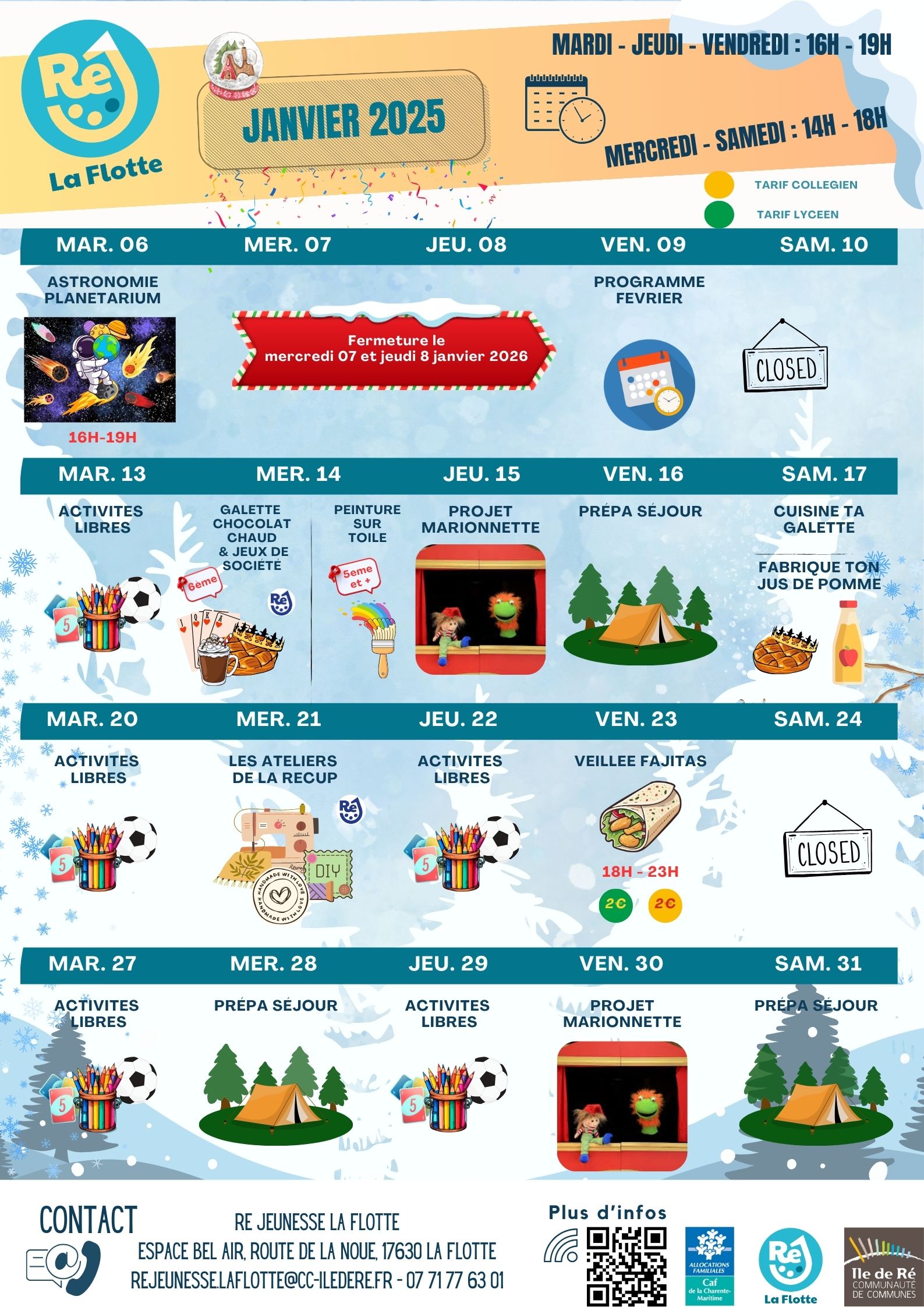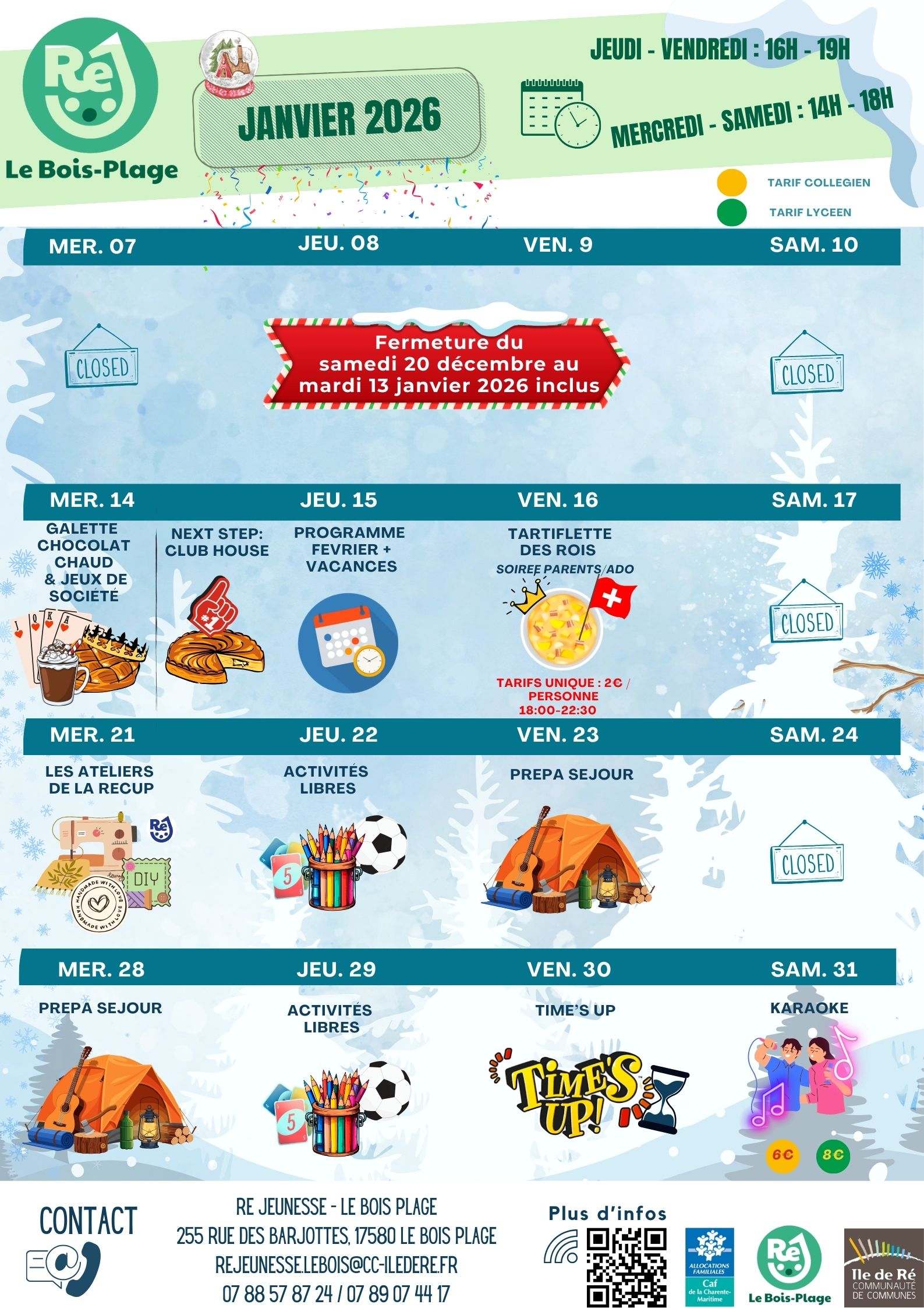 Ré Jeunesse vous accueille, à partir du 06 au 31 janvier 2026, les mardis, jeudis et vendredis de 16h00 à 19h00 et les mercredis et samedis de 14h00 à 18h00.