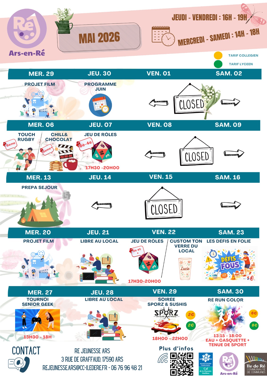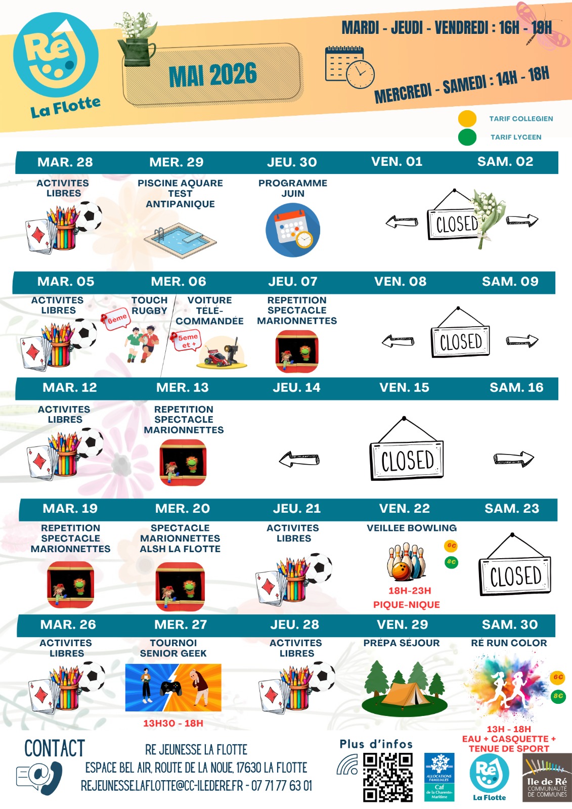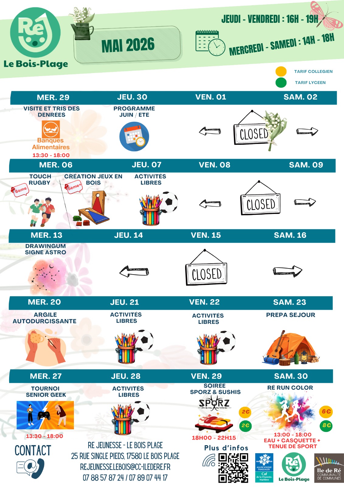 Ré Jeunesse vous accueille, à partir du 28 avril au 30 mai 2026, les mardis, jeudis et  vendredis de 16h00 à 19h00 et les mercredis et samedis de 14h00 à 18h00.