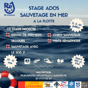 Le service Ré Jeunesse organise un stage d’initiation au sauvetage en mer sur l’île de Ré les 8, 9 et 10 juillet 2025. Ce stage est destiné à tous les jeunes âgés de 13 à 17 ans.