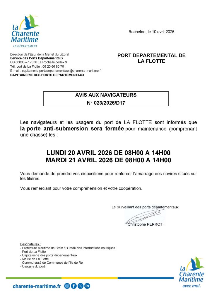 AVIS AUX NAVIGATEURS N° 023/2026/D17 – FERMETURE DE LA PORTE ANTI-SUBMERSION LES 20 ET 21 AVRIL 2026